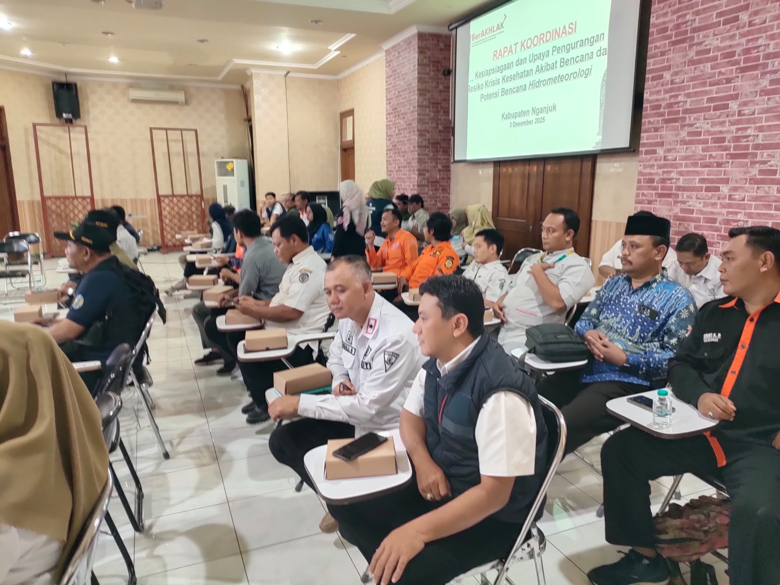 Rakor ini fokus pada kesiapsiagaan dan upaya pengurangan resiko krisis Kesehatan akibat bencana, menghadapi ancaman Banjir, Tanah Longsor, dan Cuaca Ekstrem, yang diselenggarakan oleh Dinas Kesehatan Nganjuk bersama Forum Pengurangan Resiko Bencana (FPRB).